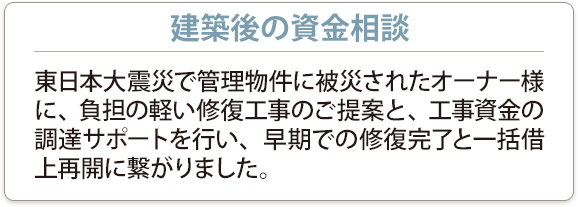 土地診断や経営・税務のアドバイスなど、資産を有効にご活用いただくためのプランニングから、ご入居者様の募集、入退居管理など運営上の煩雑な業務までトータルにバックアップ。オーナー様が抱えるお悩みやご苦労を、各分野に精通したプロフェッショナルが豊富なノウハウを駆使して的確に解消。充実のサポート体制を整えています。